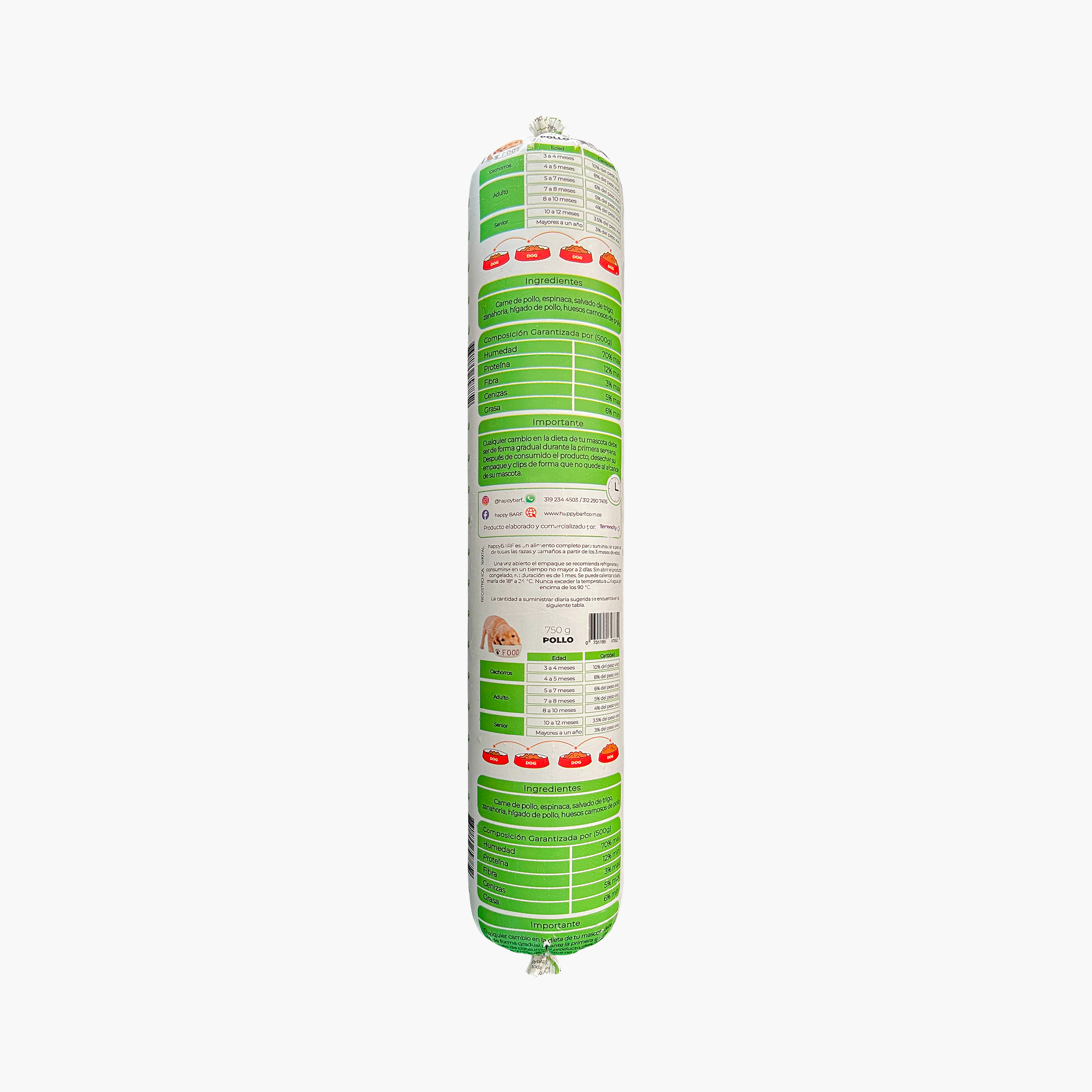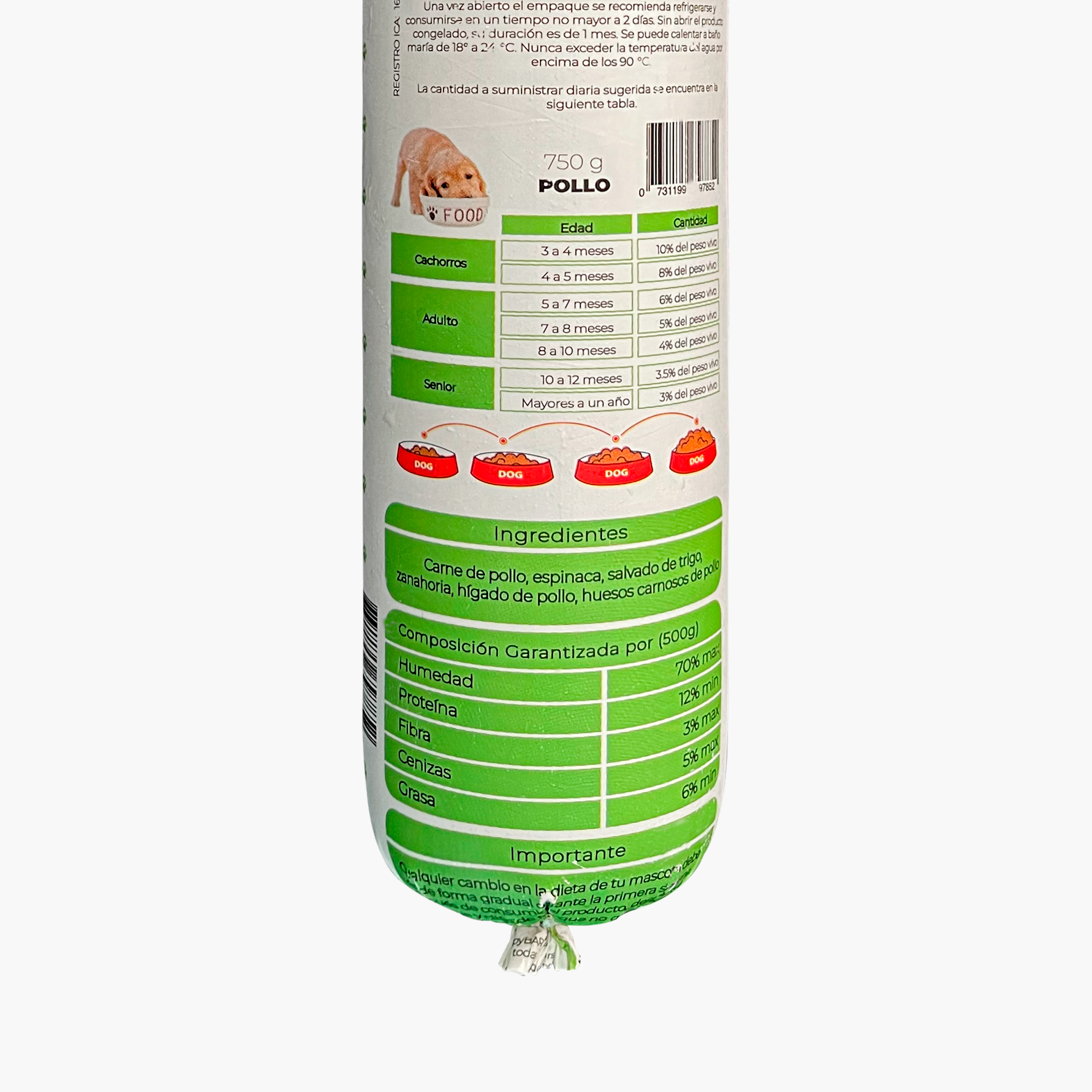 Alimento completo tipo BARF , para ser suministrado a perros de todas las razas y tamaños a partir de los 3 meses de edad, obtenido de la mezcla especialmente balanceada de ingredientes de origen natural. Sus ingredientes pollo, verdura y avena o salvado de trigo son molidos y mezclados, para luego ser empacados en poliamida y sellado en clips de aluminio para su posterior congelación.