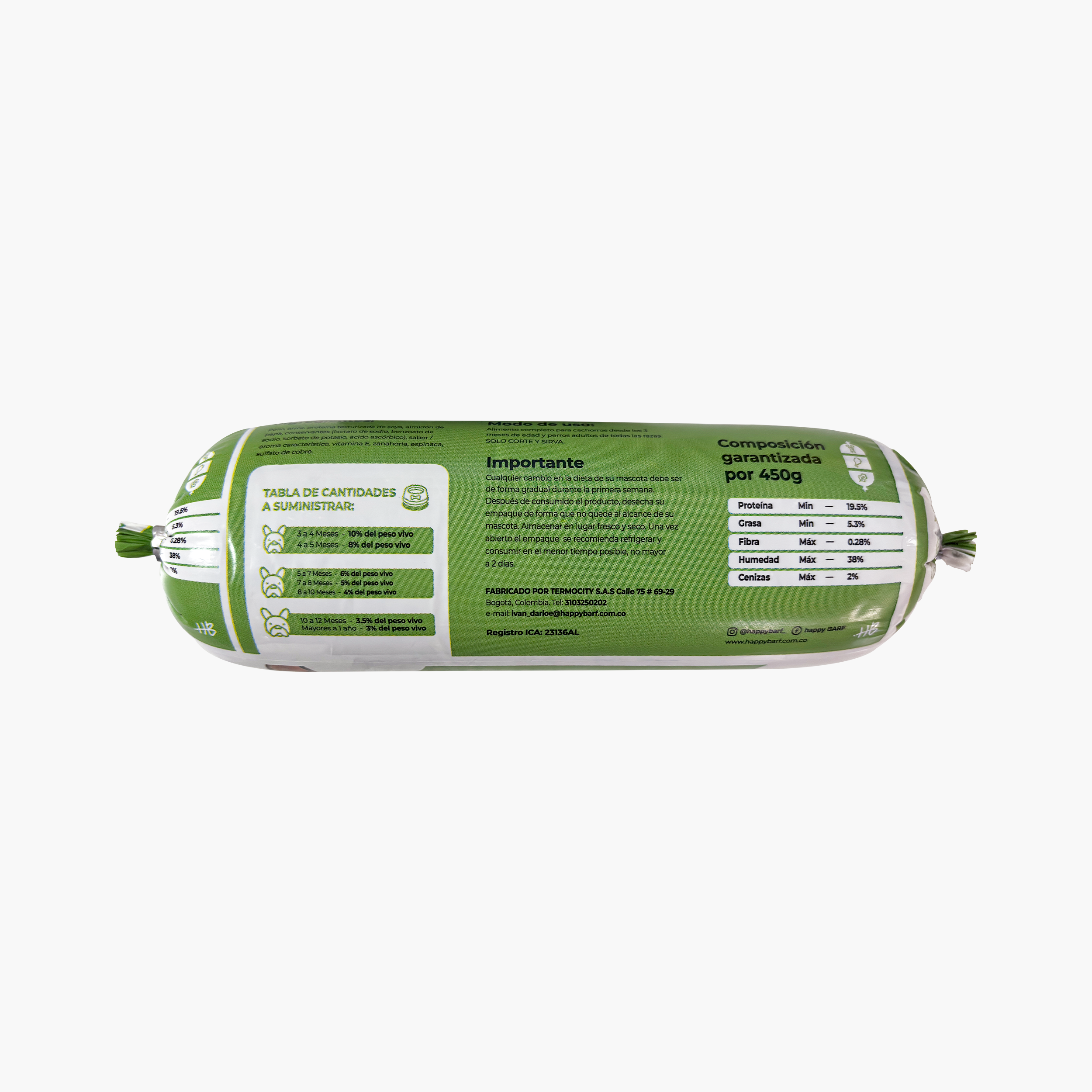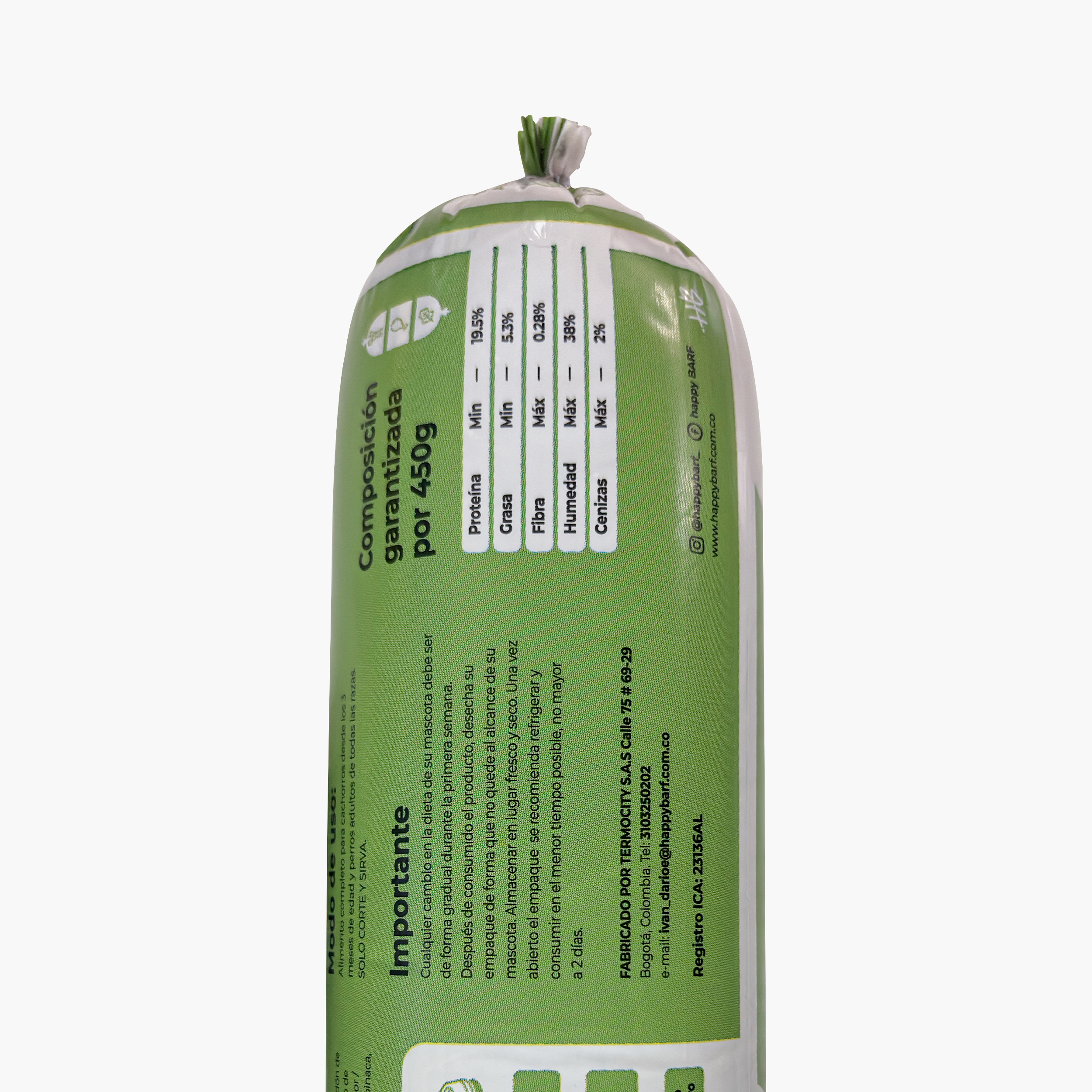 Alimento completo tipo BARF , para ser suministrado a perros de todas las razas y tamaños a partir de los 3 meses de edad, obtenido de la mezcla especialmente balanceada de ingredientes de origen natural. Sus ingredientes pollo, verdura y avena o salvado de trigo son molidos y mezclados, para luego ser empacados en poliamida y sellado en clips de aluminio para su posterior congelación.