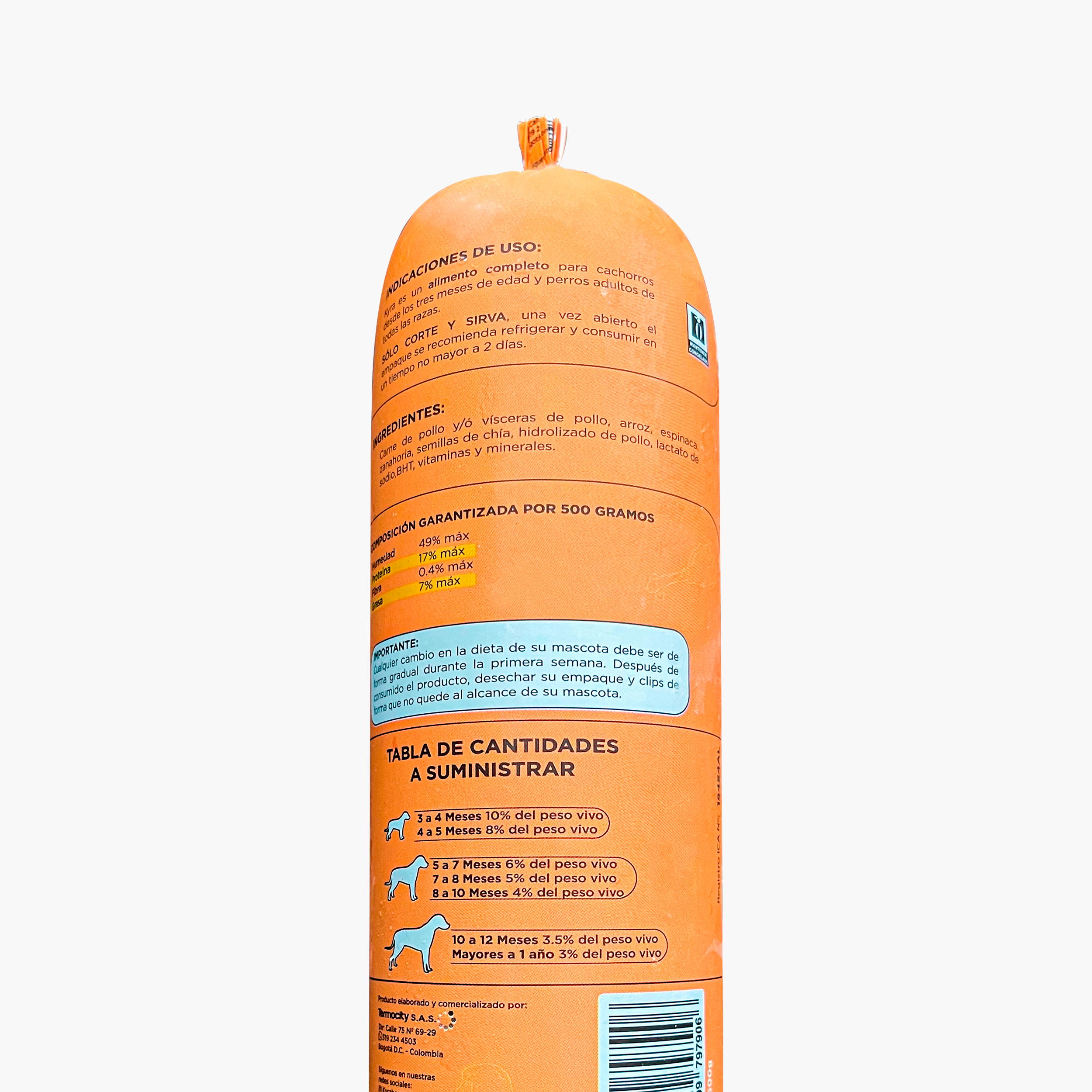Alimento completo tipo HORNEADO , para ser suministrado a perros de todas las razas y tamaños a partir de los 3 meses de edad, obtenido de la mezcla especialmente balanceada de ingredientes de origen natural. Sus ingredientes carne de pollo, carne de res, verdura y arroz son molidos y mezclados, para luego ser empacados en poliamida y sellado en clips de aluminio para su posterior congelación.